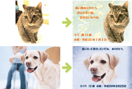 ペット火葬日当日にお写真をお預かりし、デジタル編集後に郵送するサービスです。お預かりしたお写真の画質により仕上がりの画質が異なります。大きくはっきり写っているお写真をお探し下さい。詳しくは当日火葬担当者にお尋ね下さい。